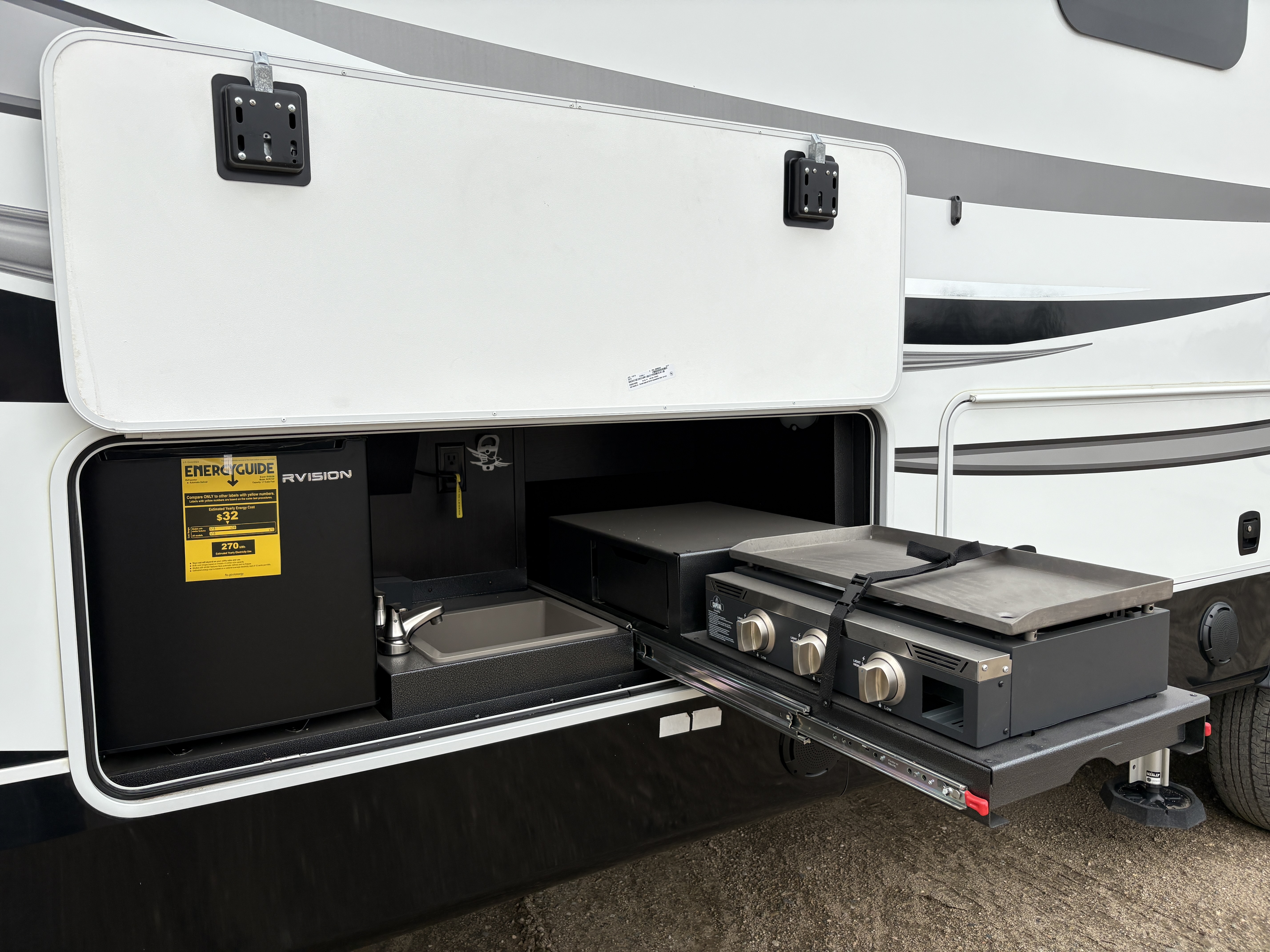 - Fully enclosed, LED-lit universal docking center: selectable water connections, quick-connect outside shower, black tank flush, winterization and sanitation, independent satellite and whole coach cable hookups
