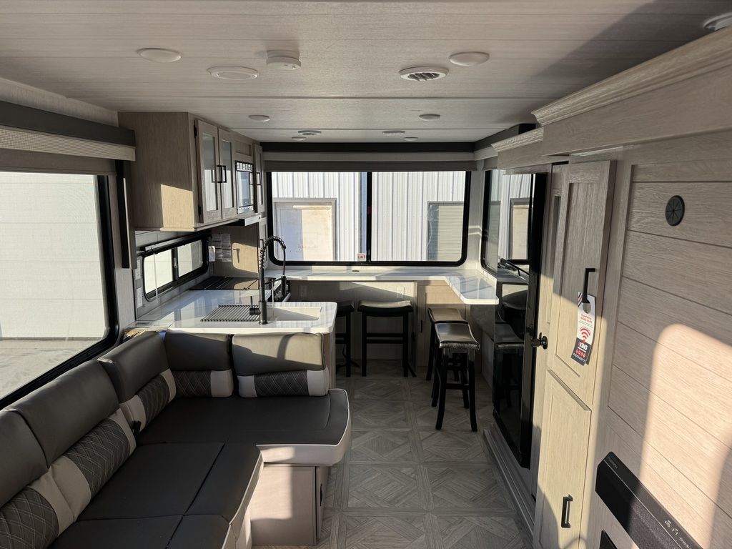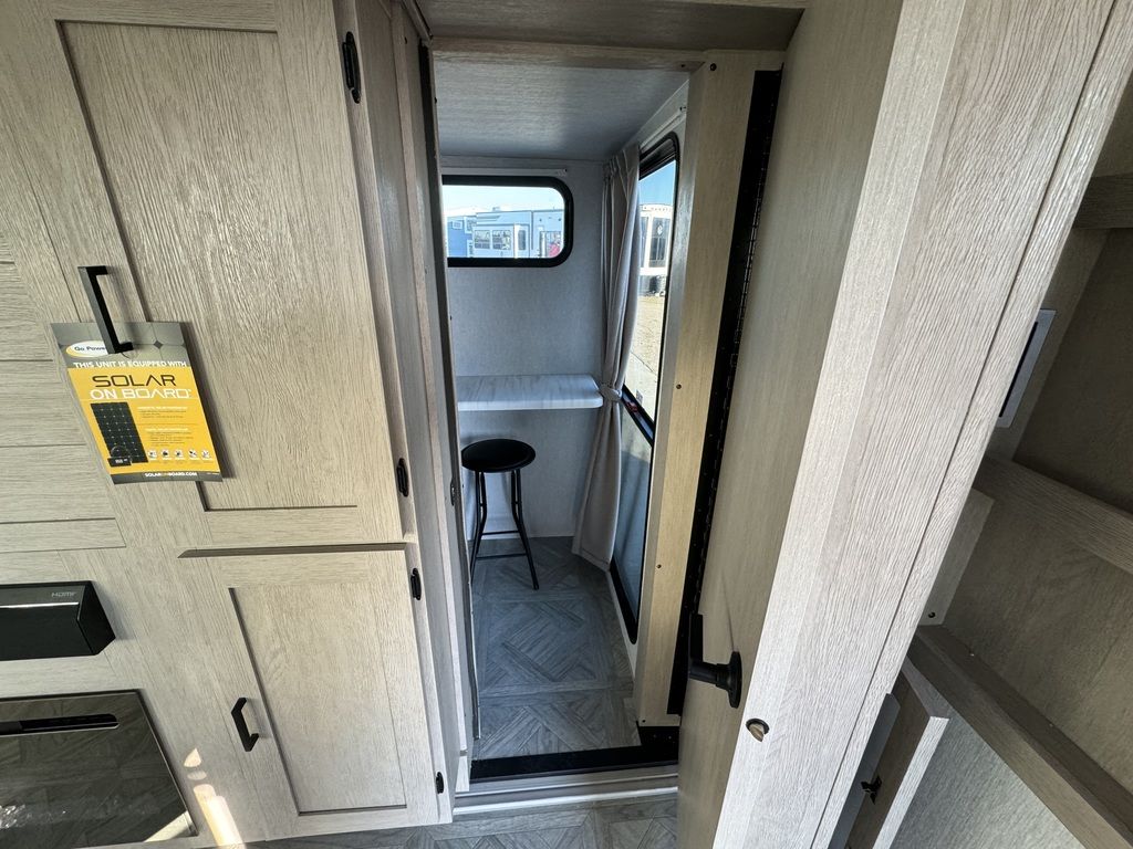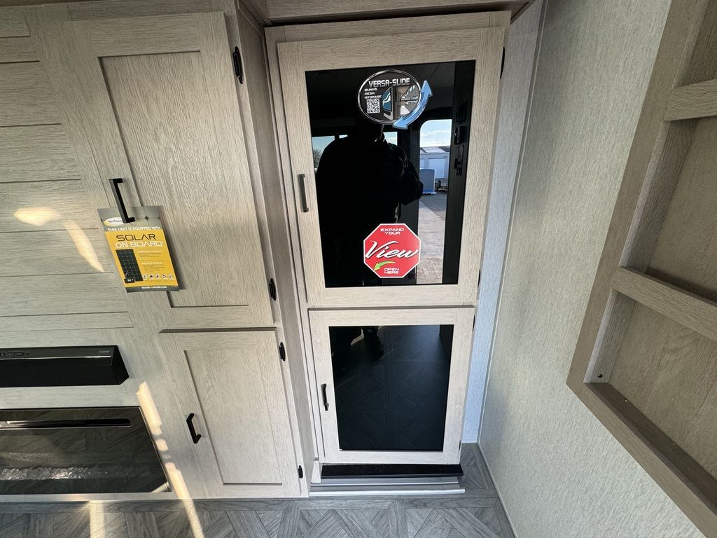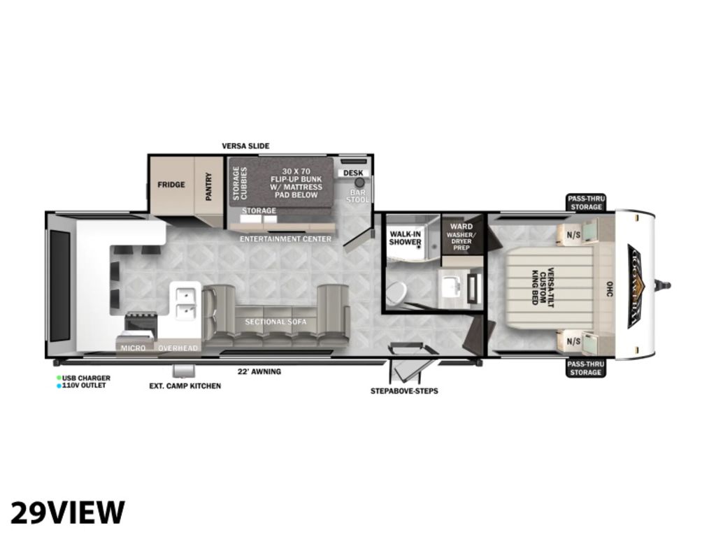 The 29VIEW offers standard hung fiberglass exterior and solid surface countertops. Features the Versa-Slide offering additional storage, bunks and capability to utilize as an office. This model bypasses a traditional dinette but offers 18 linear feet of countertop space and the 105 square feet of windows offers a view that is unrivaled in this segment.