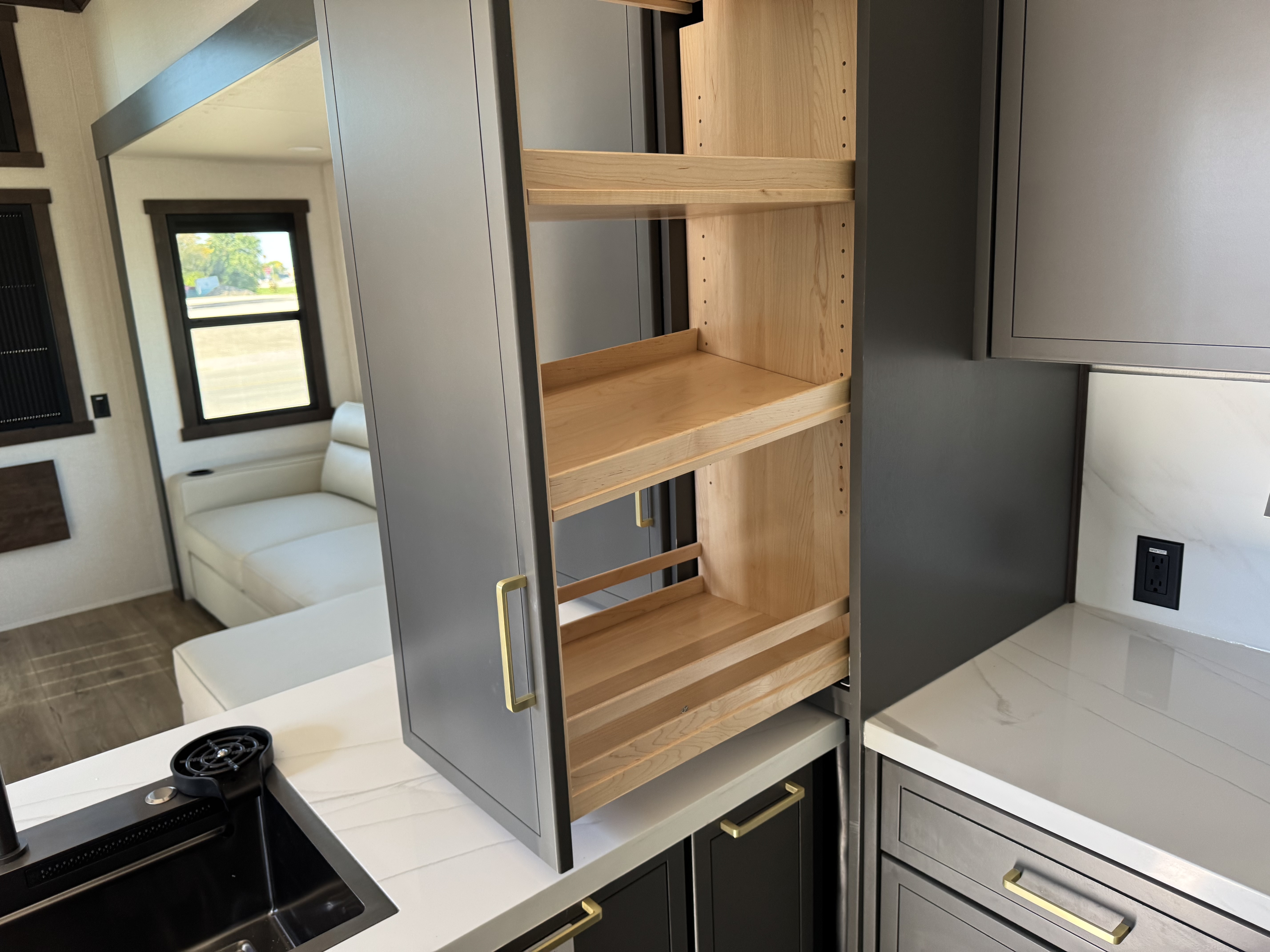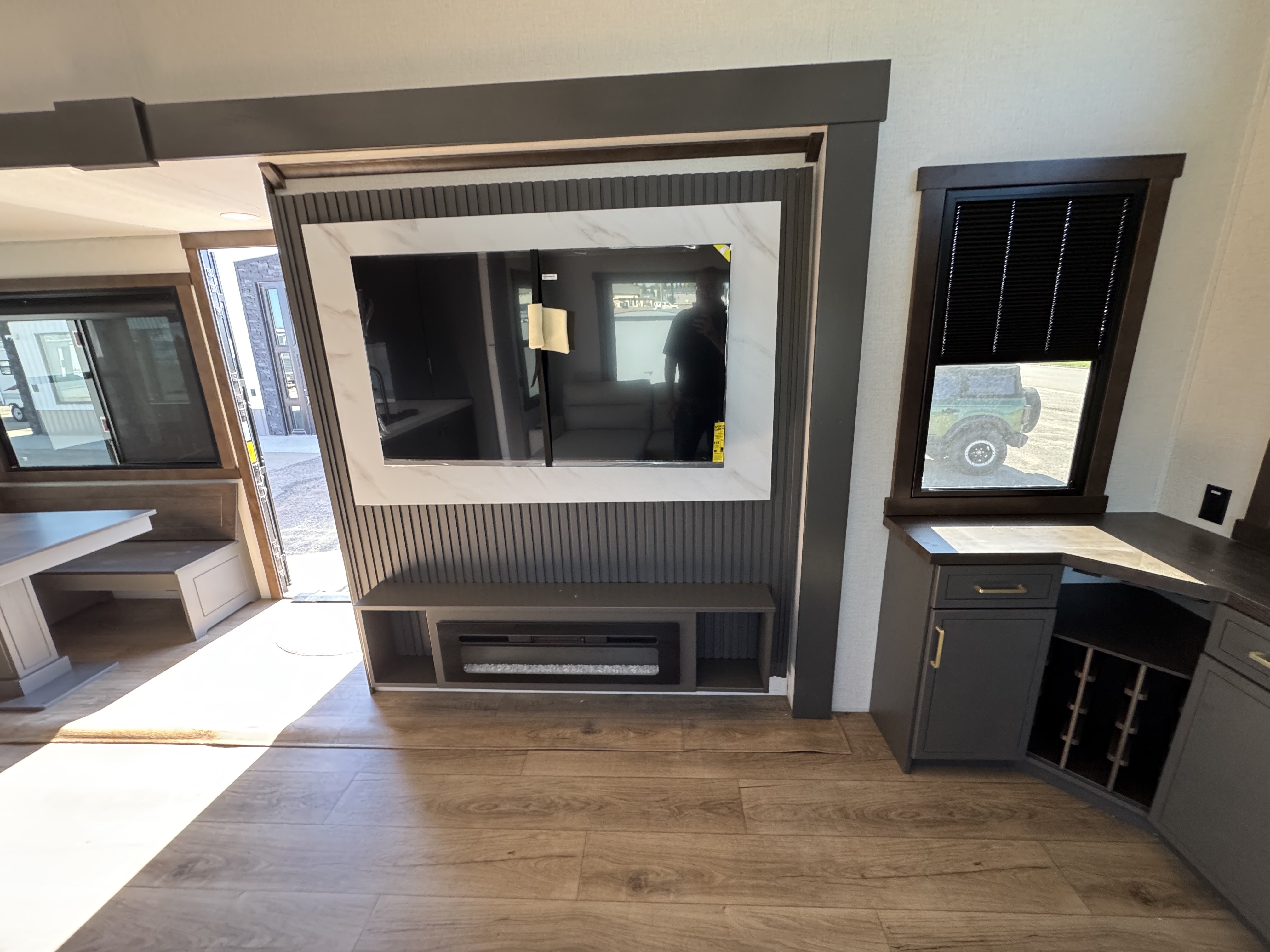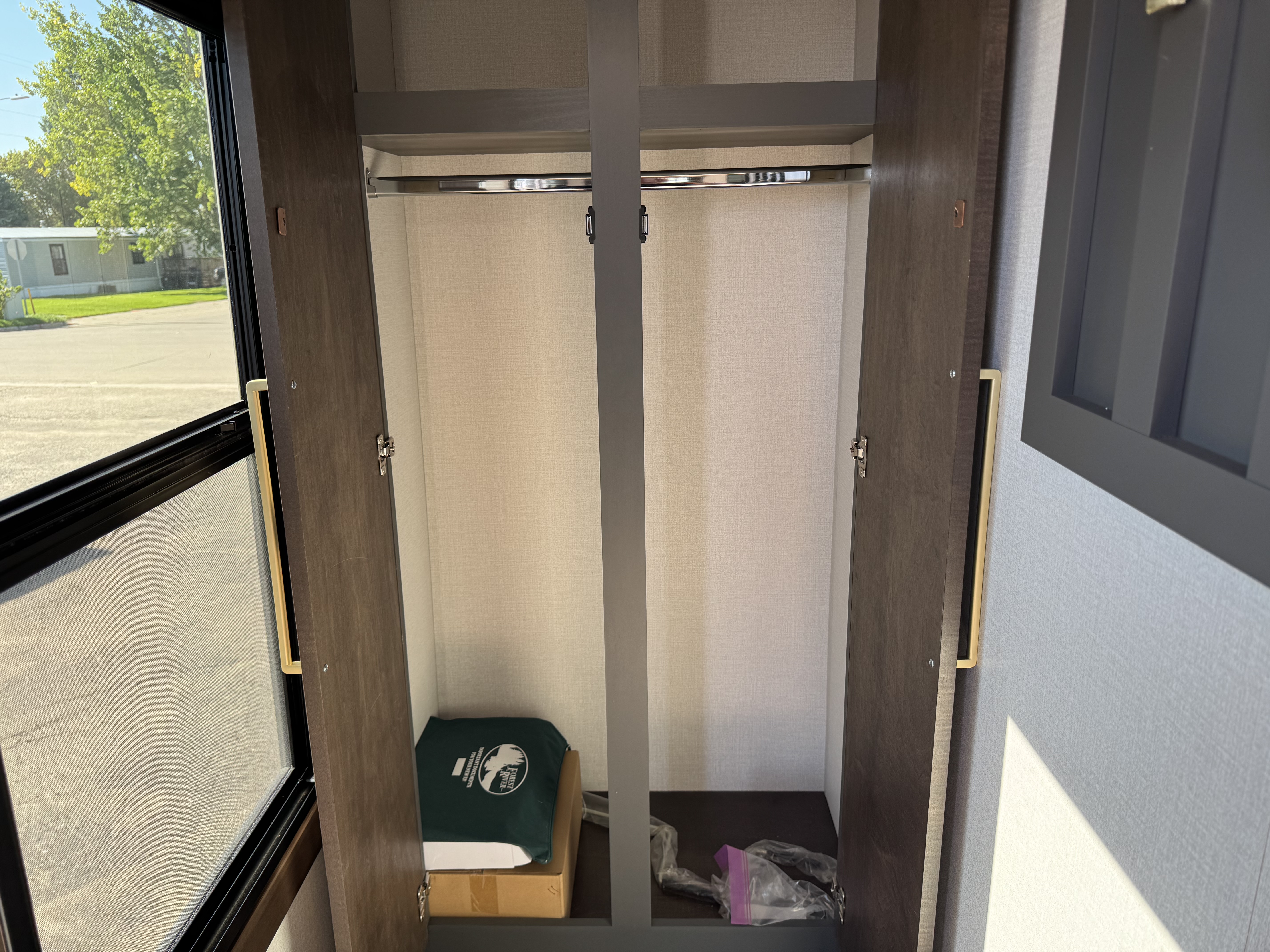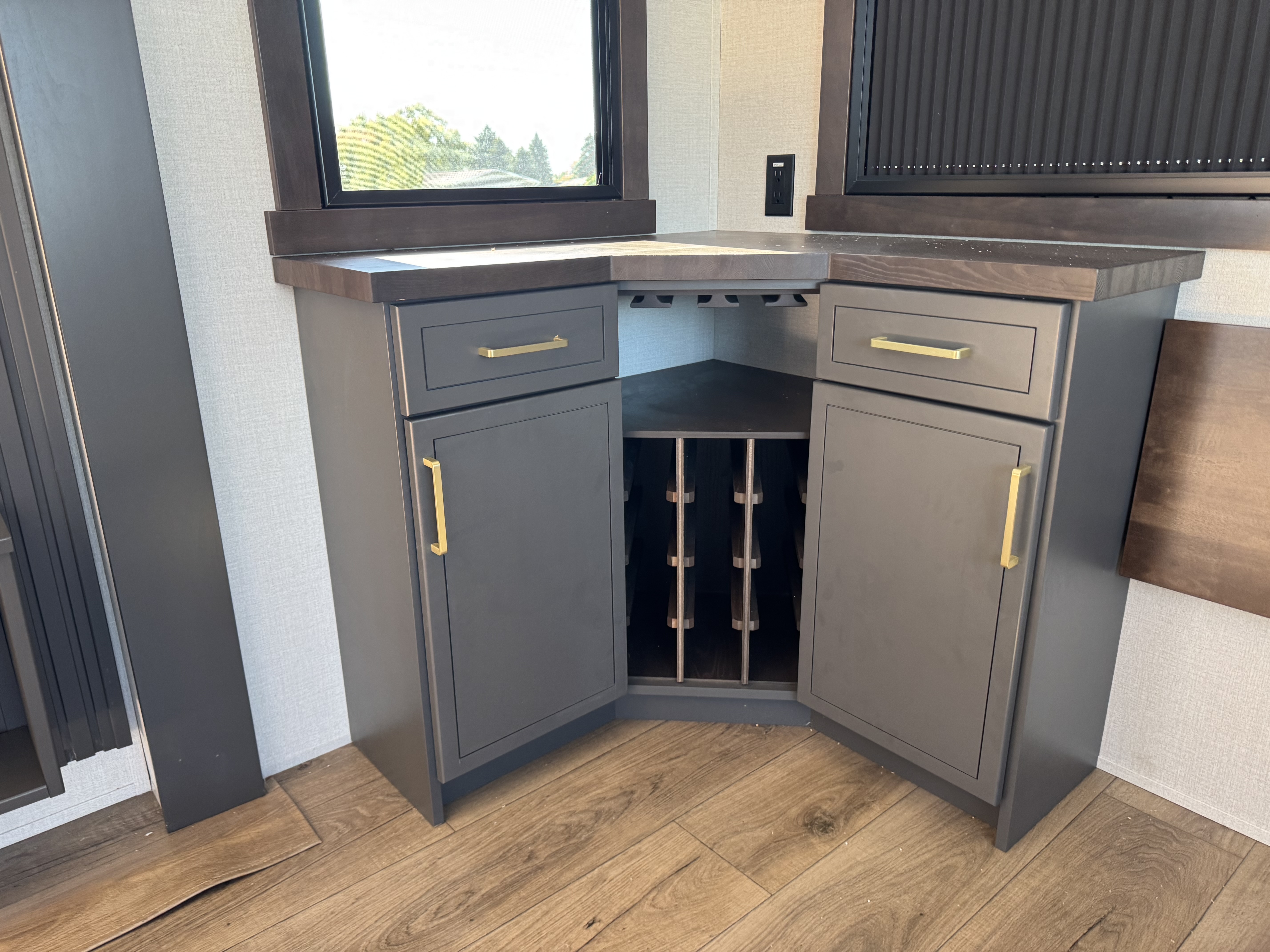 The 412FWC maximizes space with functionality. Step through the massive 38" entrance door and into the mud room, or relax on the L shape sofa and watch TV. This coach also features and area to work with a flip up desk, or an area to entertain with a wine bar. Interior features like custom cabinetry blends with modern amenities like a washer and dryer, adjustable shelves, king bed and more to provide the ultimate stay.