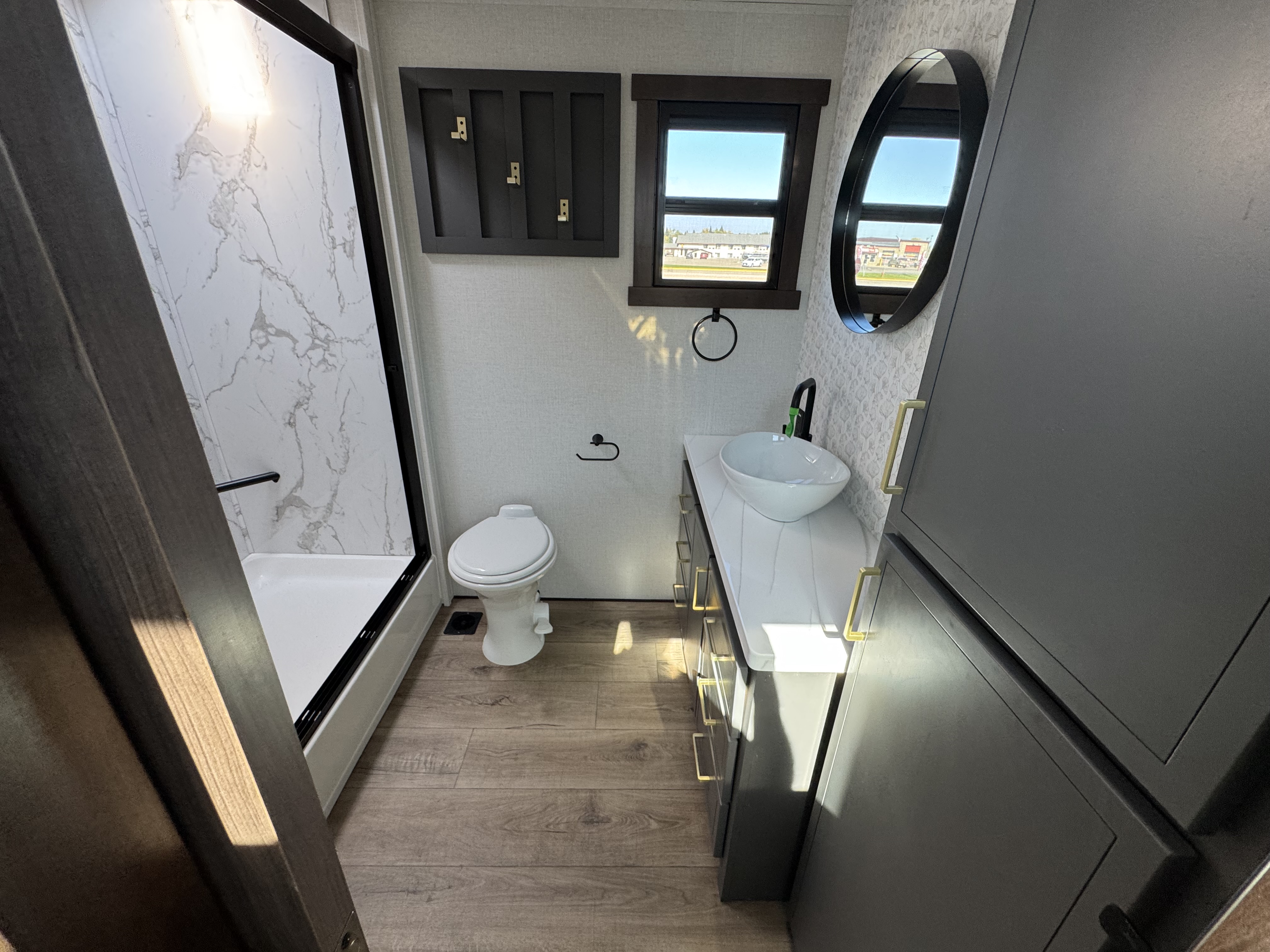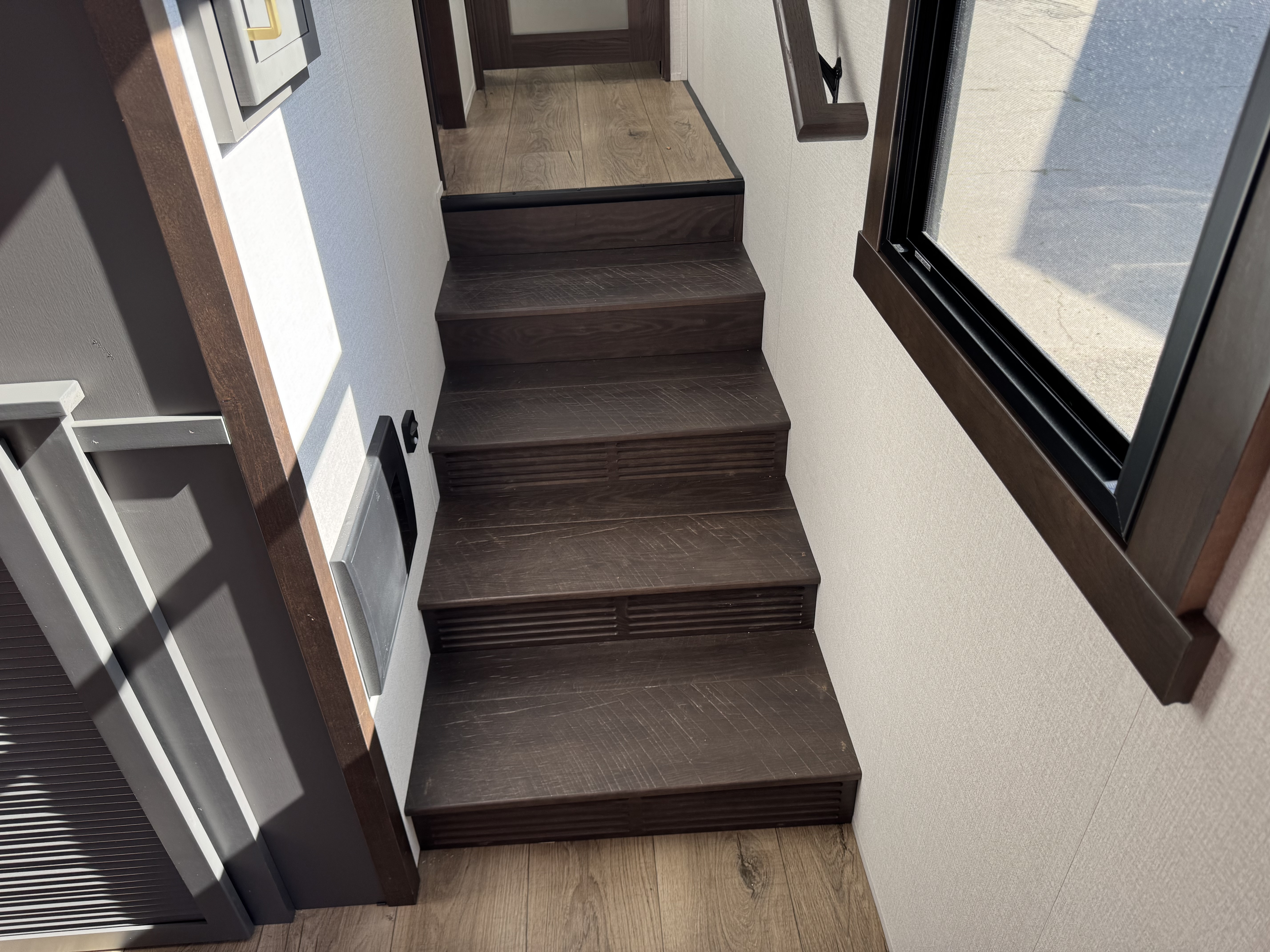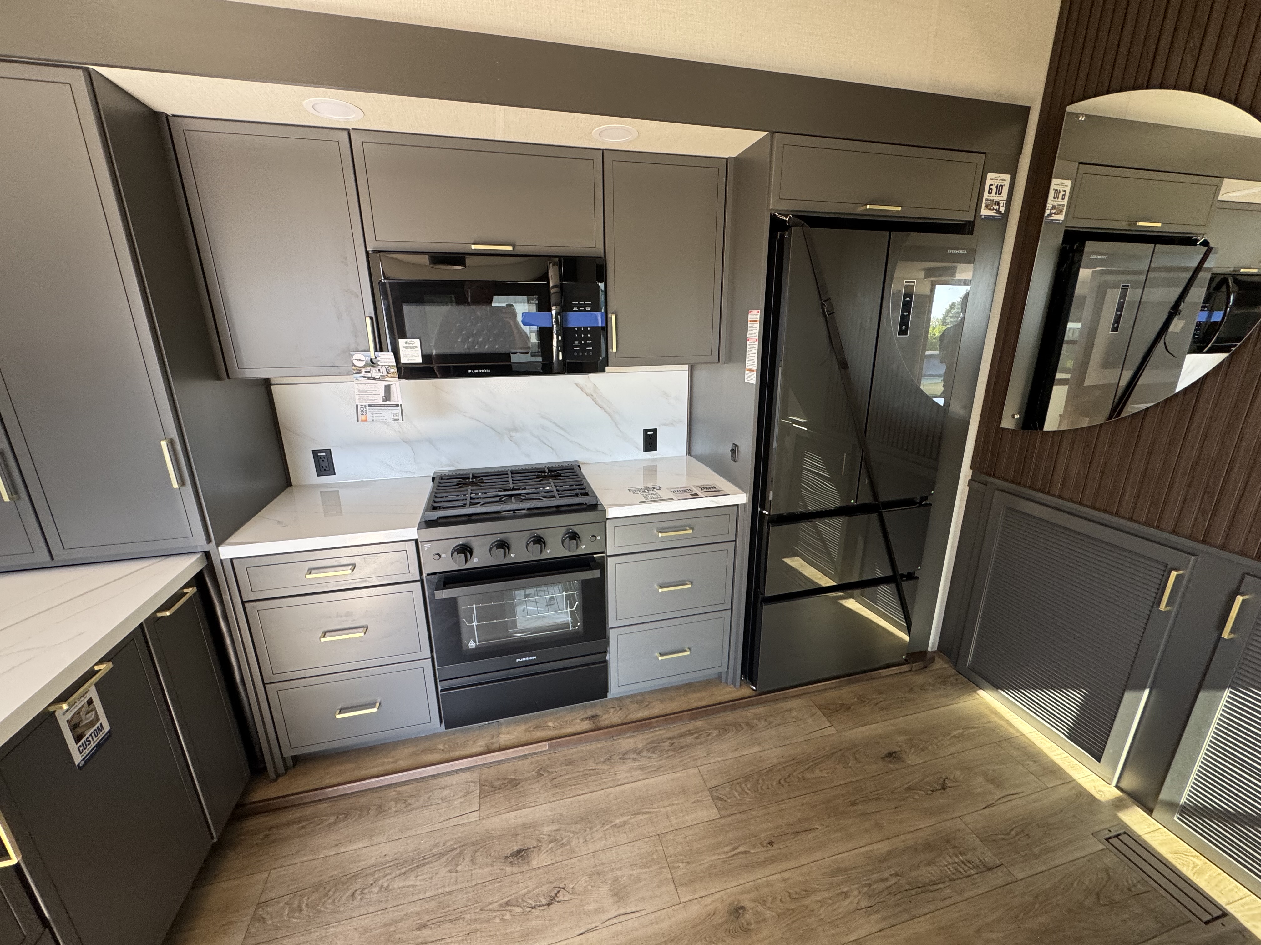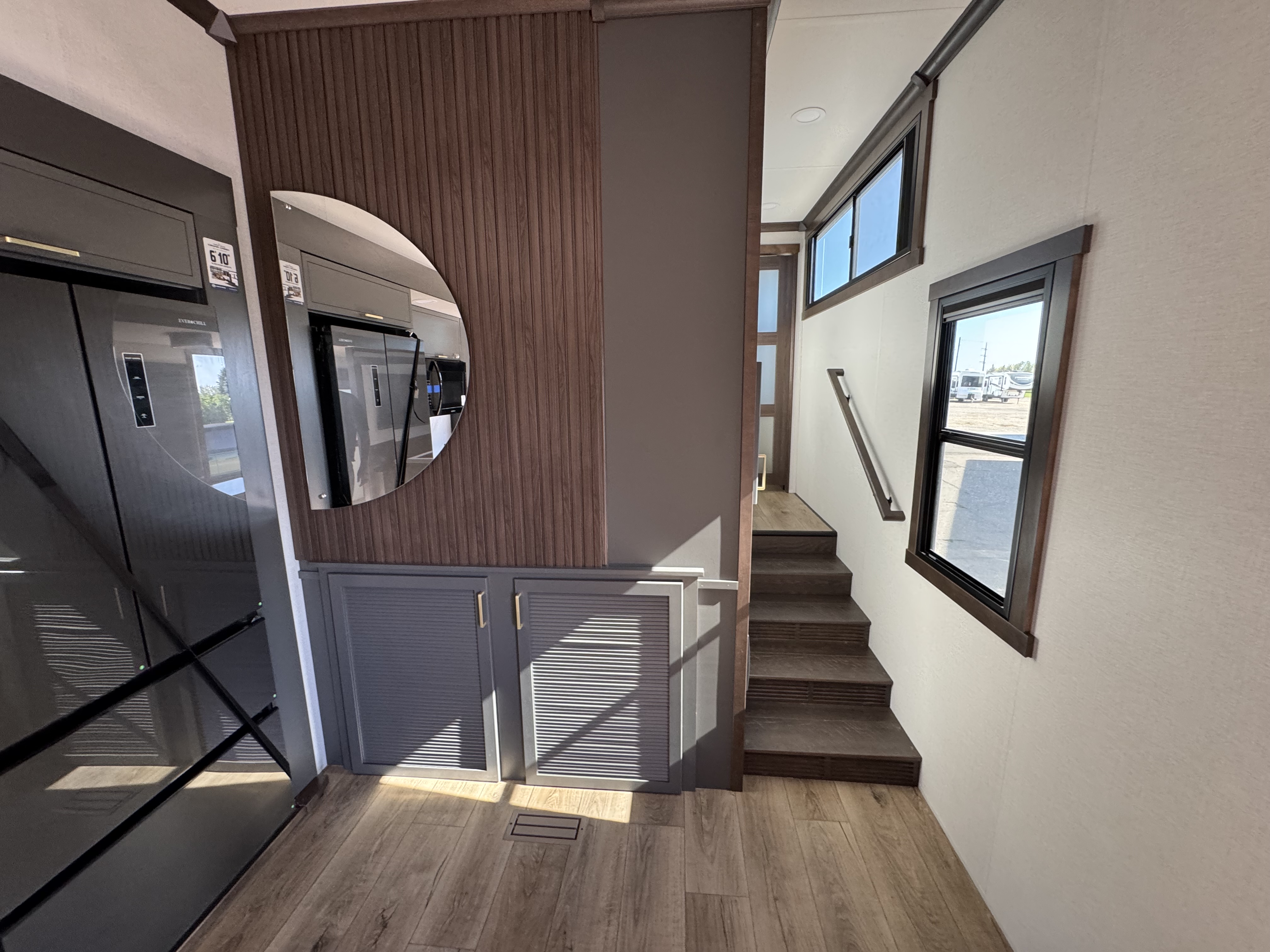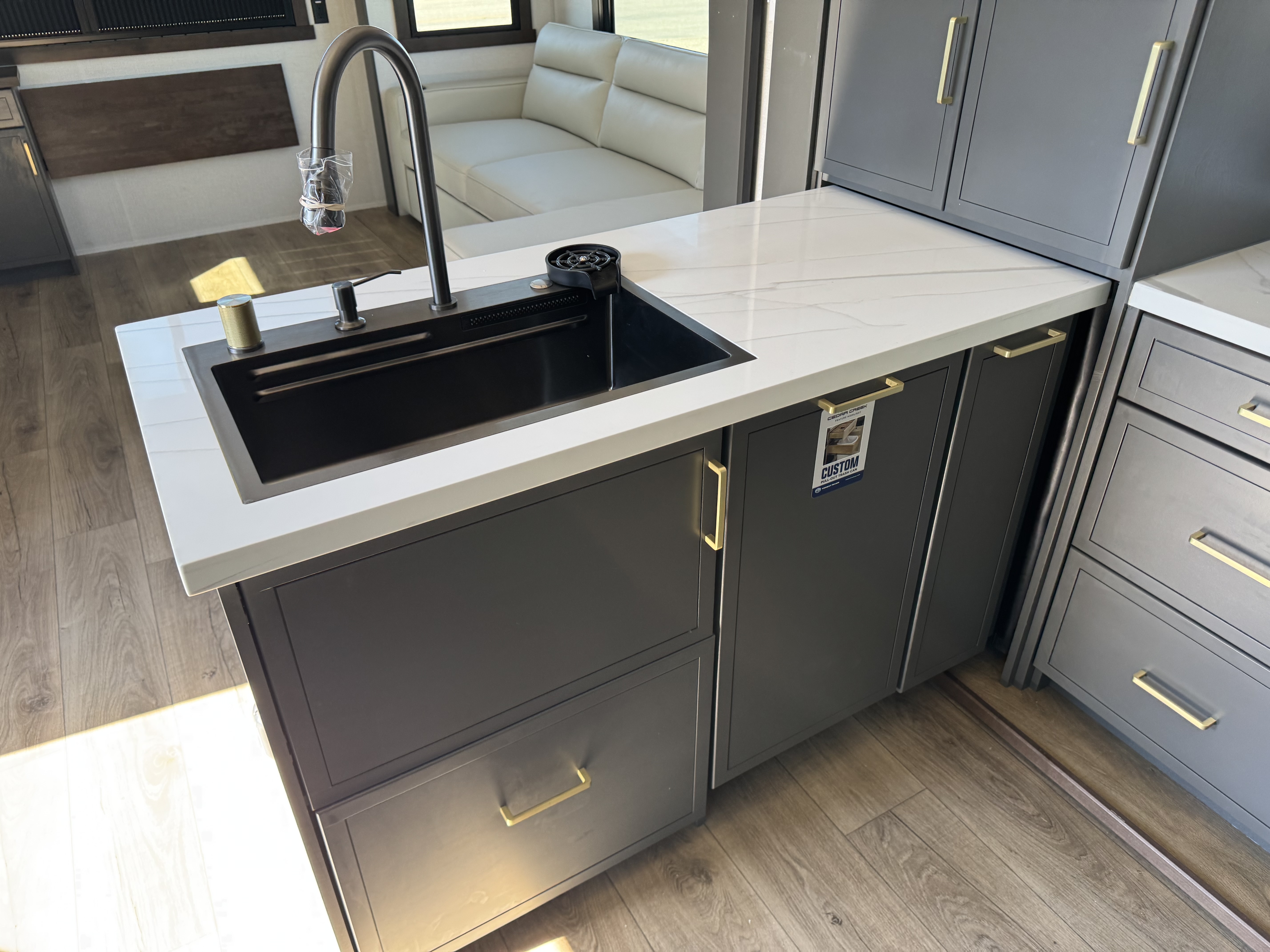 The 412FWC maximizes space with functionality. Step through the massive 38" entrance door and into the mud room, or relax on the L shape sofa and watch TV. This coach also features and area to work with a flip up desk, or an area to entertain with a wine bar. Interior features like custom cabinetry blends with modern amenities like a washer and dryer, adjustable shelves, king bed and more to provide the ultimate stay.