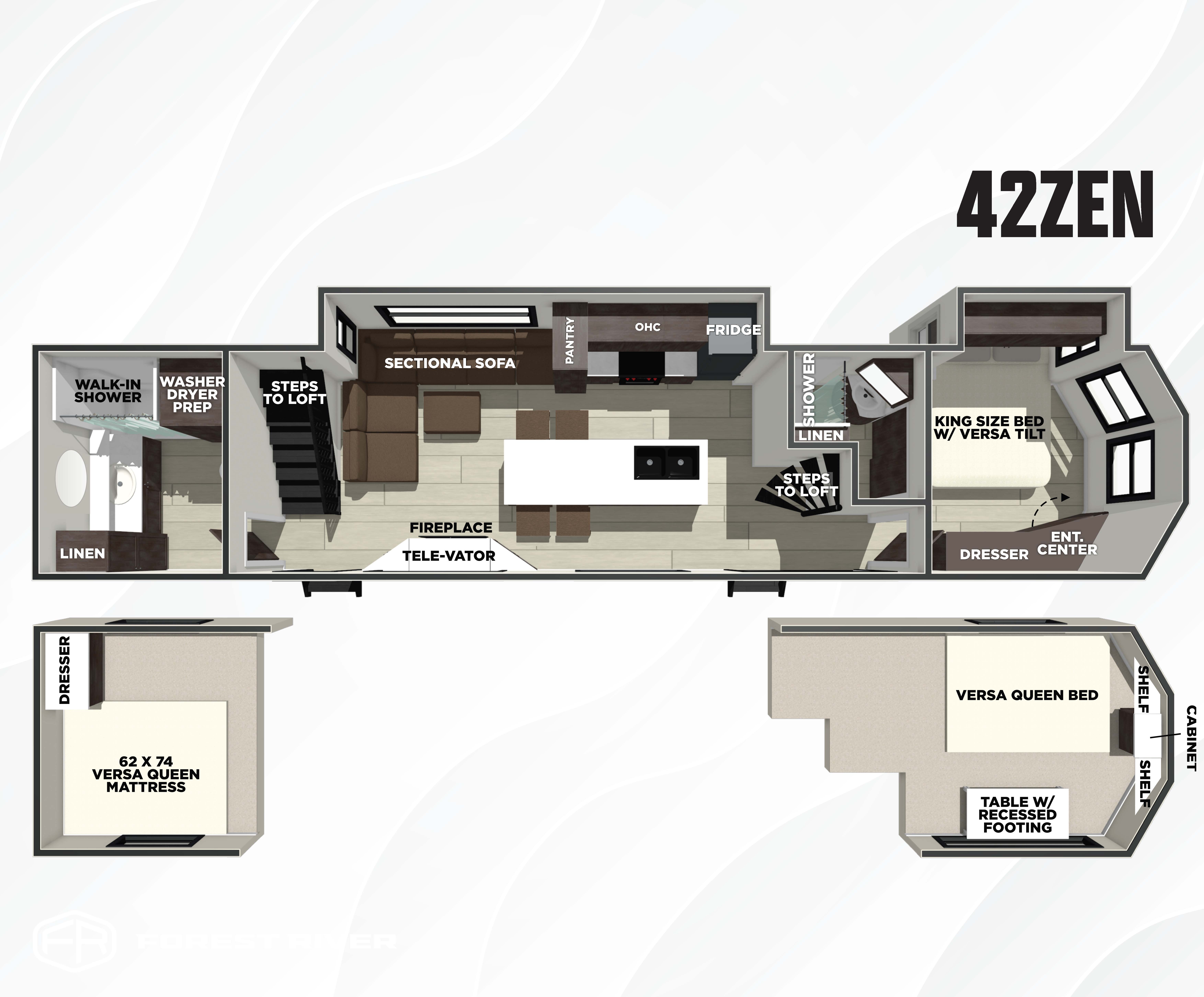 OPTIONS: LODGE Solid Surface Countertops (Forced) 40" HD TV Washer/Dryer Prep *(40FDEN, 40RLB) Detachable Hitch Non-Self Contained w/China House Toilet (No Tanks)*(N/A 2nd Bath 42DMS&42QBQ) Gel Coat Exterior Fiberglass Stab Jacks (6) Outside Shower Extreme Weather Package (Calculated R-38 Reflective Foil in Roof & Floor) 2nd 15k BTU A/C in Bedroom GRAND LODGE Solid Surface Countertops (Forced) Detachable Hitch (N/A 42DL, 42VERANDA, 42VIEW or 44VIEW) Gel Coat Exterior Fiberglass (STD on 42VERANDA, 42VIEW & 44VIEW) Washer/Dryer Prep (STD on 42VERANDA, 42VIEW & 44VIEW) Non-Self Contained w/China House Toilet (No Tanks) Stab Jacks (6) Outside Shower Extreme Weather Package (Calculated R-38 Reflective Foil in Roof & Floor)