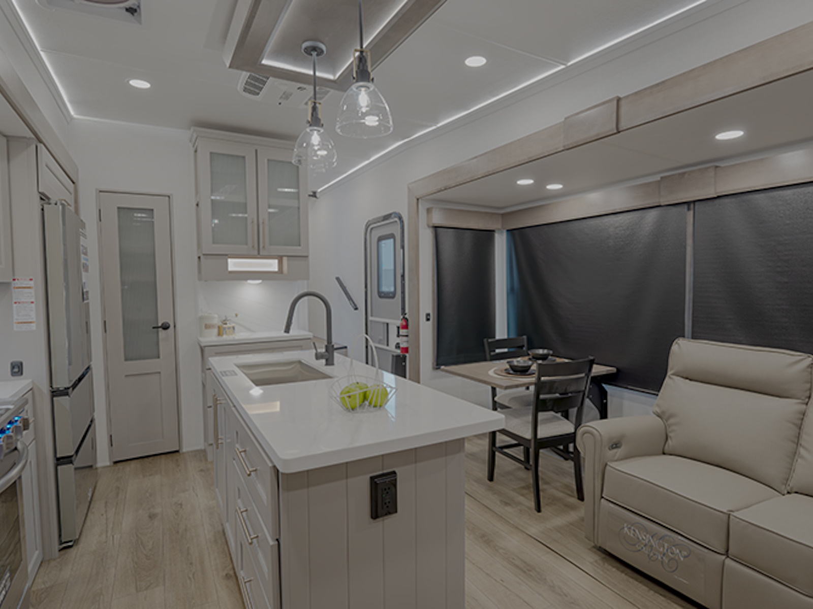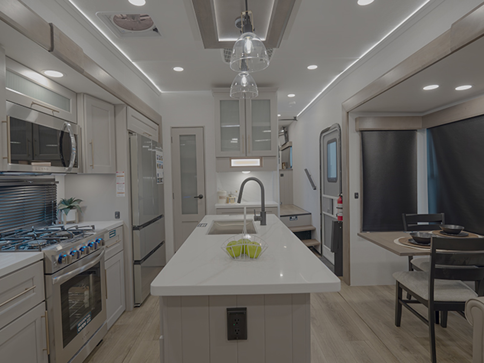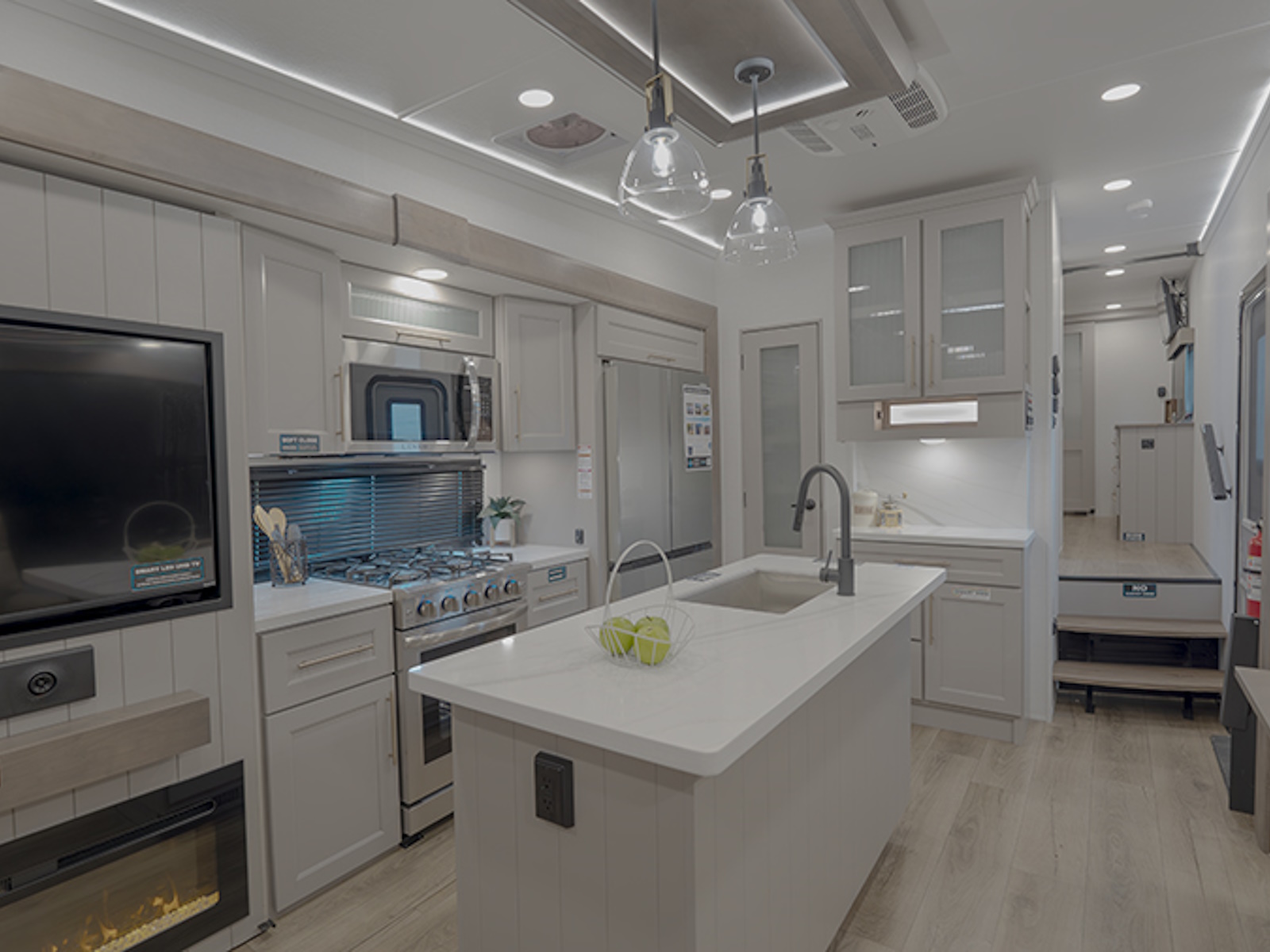 Step inside to a rear living area that’s designed for relaxation and entertainment. The dual recliner love seat faces a cozy fireplace and a large 50" Smart TV—the perfect setting to unwind after a day of exploring. The flush-floor kitchen slide creates a spacious cooking and dining area, with a kitchen island featuring a large undermount sink and dishwasher prep option, making clean-up a breeze. You’ll find two pantries for ample storage, plus a residential microwave, range, and a 3.73 cu. ft. oven to prepare delicious meals on the road.