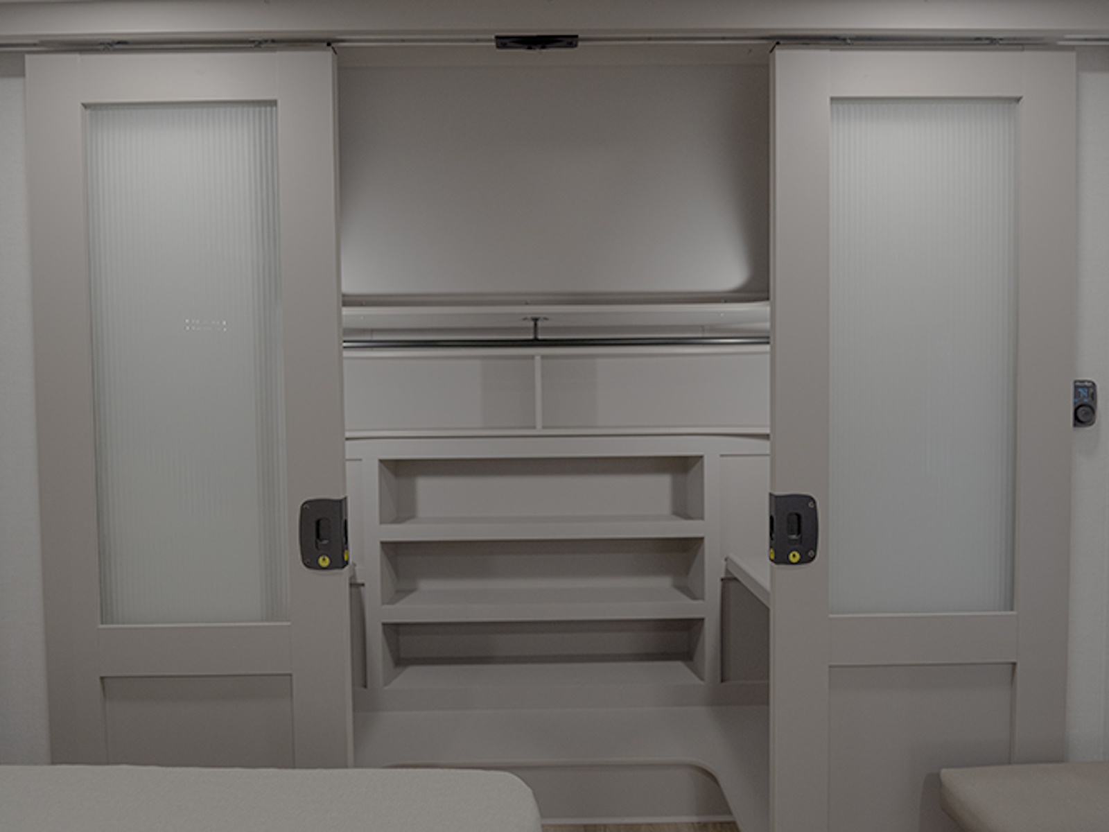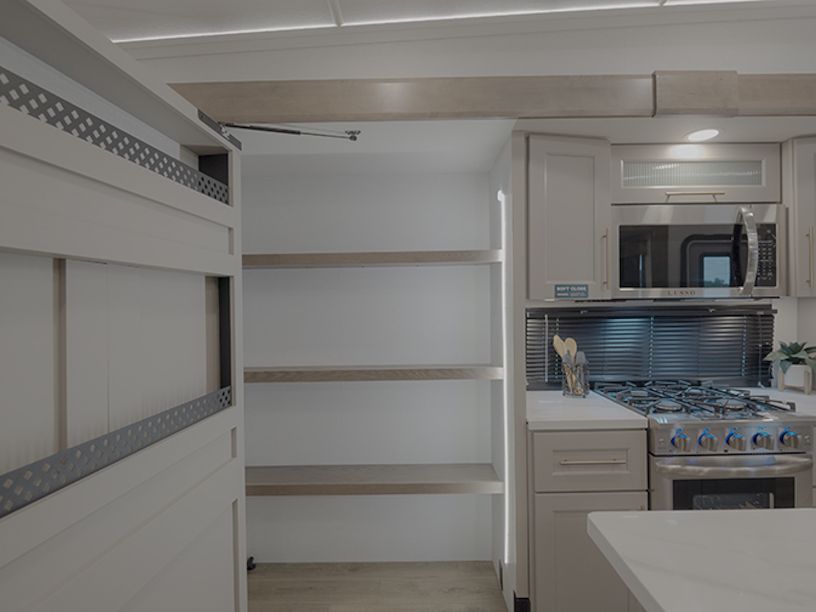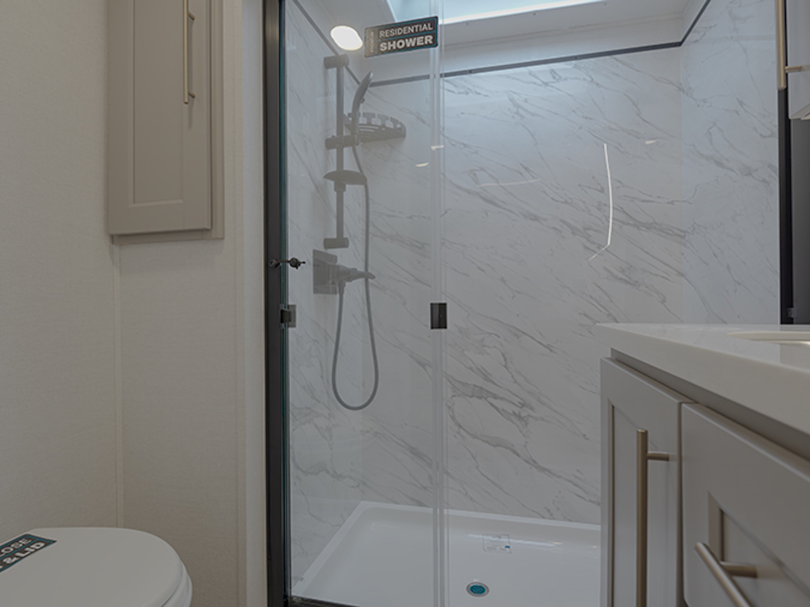 The master bedroom features a king bed slide and is equipped with a Smart TV, a dresser with flip-up hidden storage, and plenty of room for your belongings. The adjacent full bathroom offers a residential-style shower, a porcelain toilet with a soft-close seat, and dedicated linen storage for all your necessities.