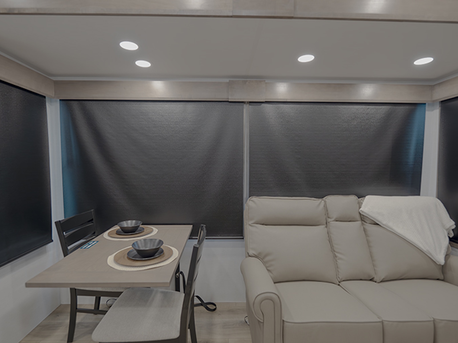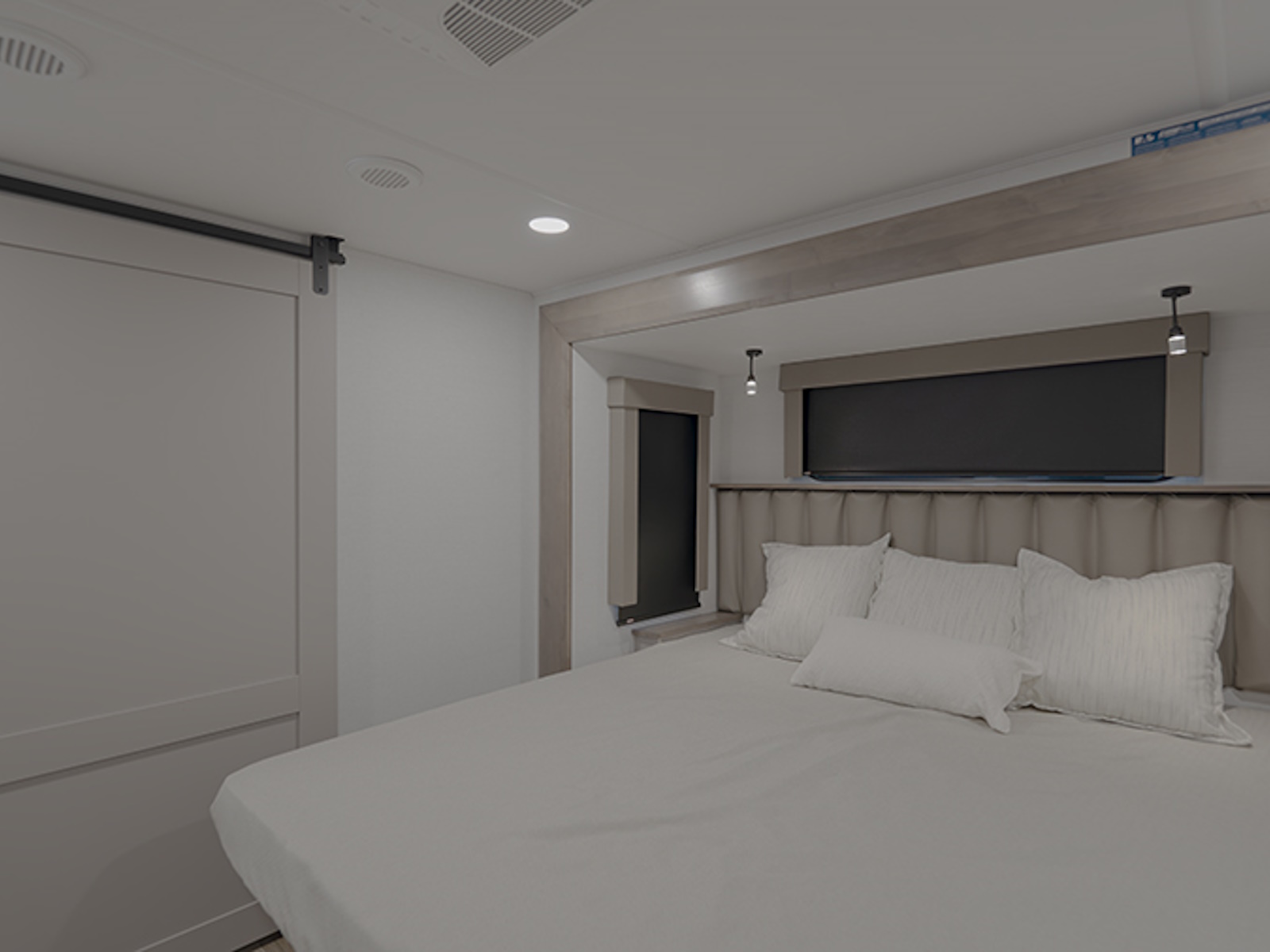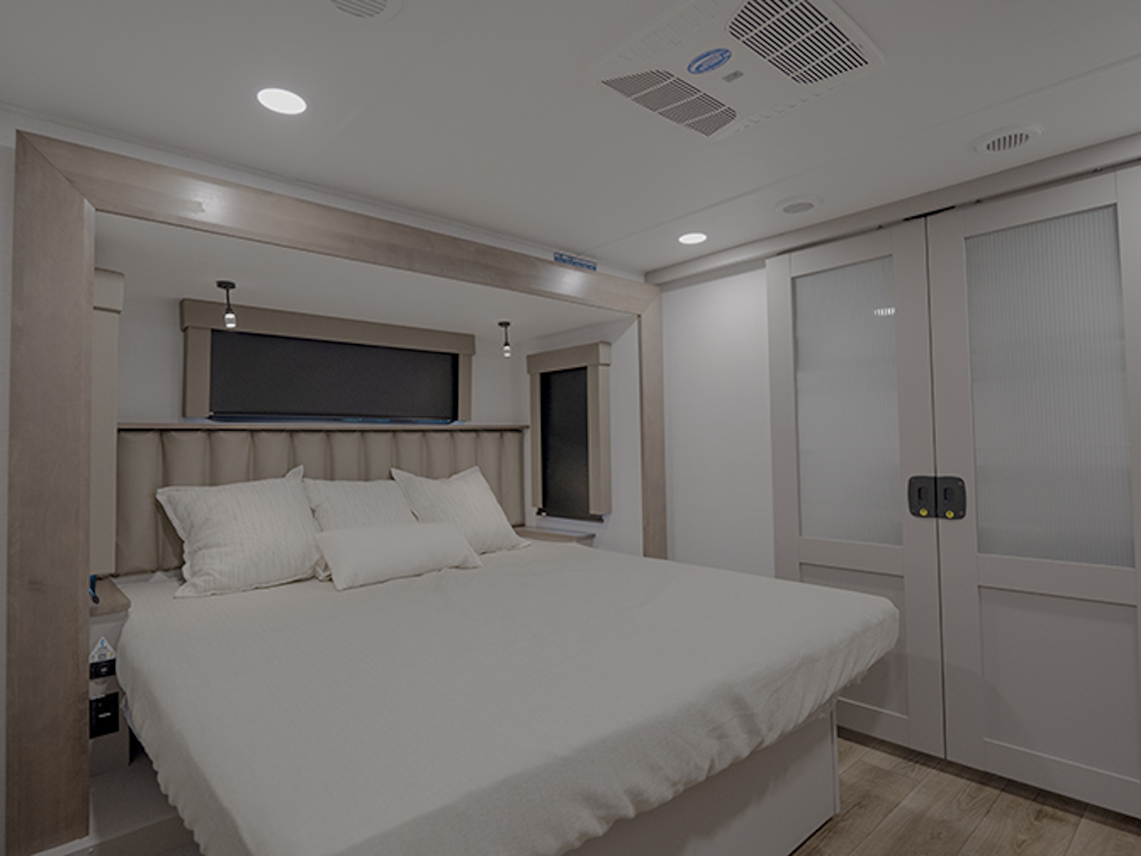 The master bedroom features a king bed slide and is equipped with a Smart TV, a dresser with flip-up hidden storage, and plenty of room for your belongings. The adjacent full bathroom offers a residential-style shower, a porcelain toilet with a soft-close seat, and dedicated linen storage for all your necessities.