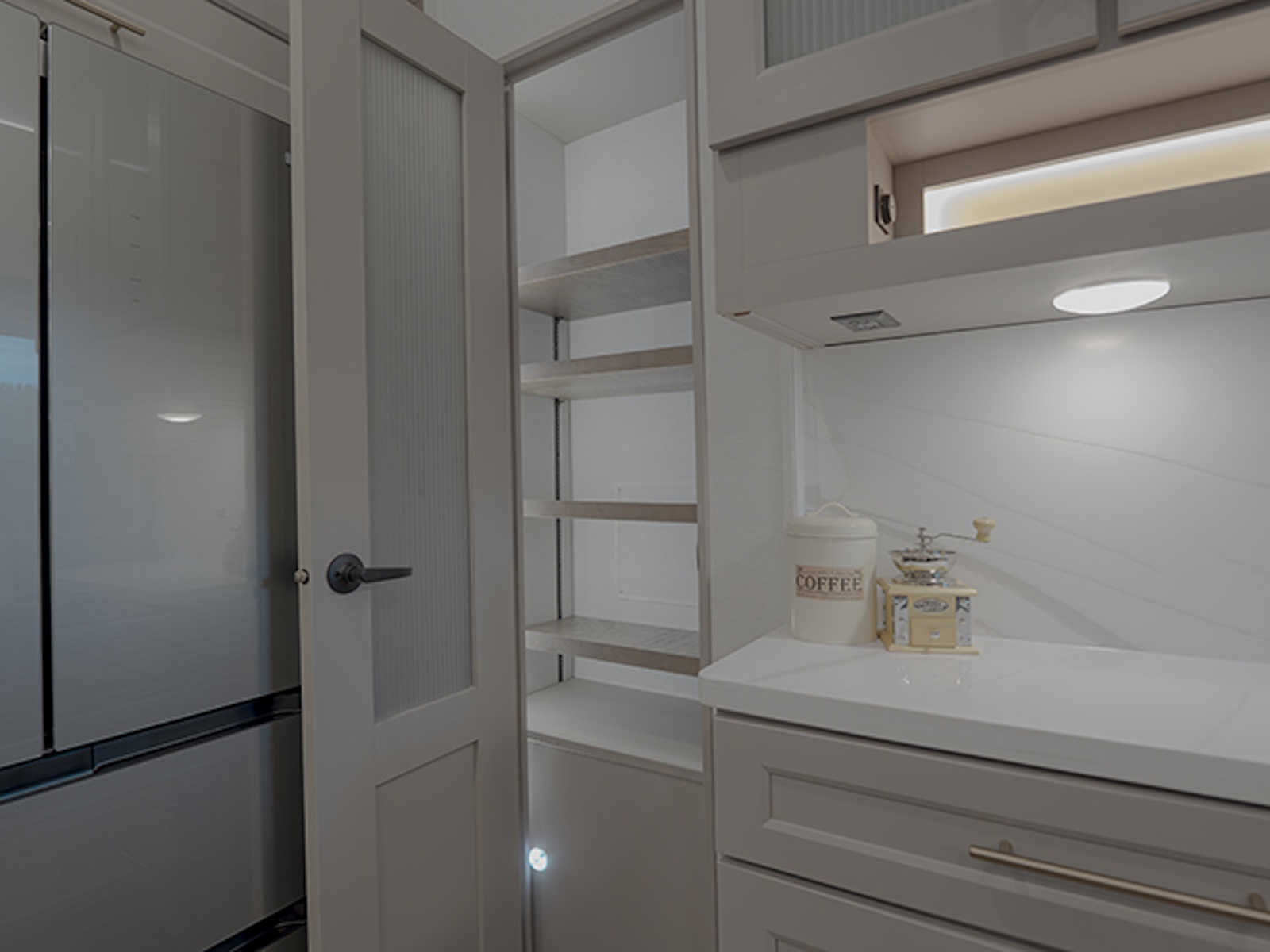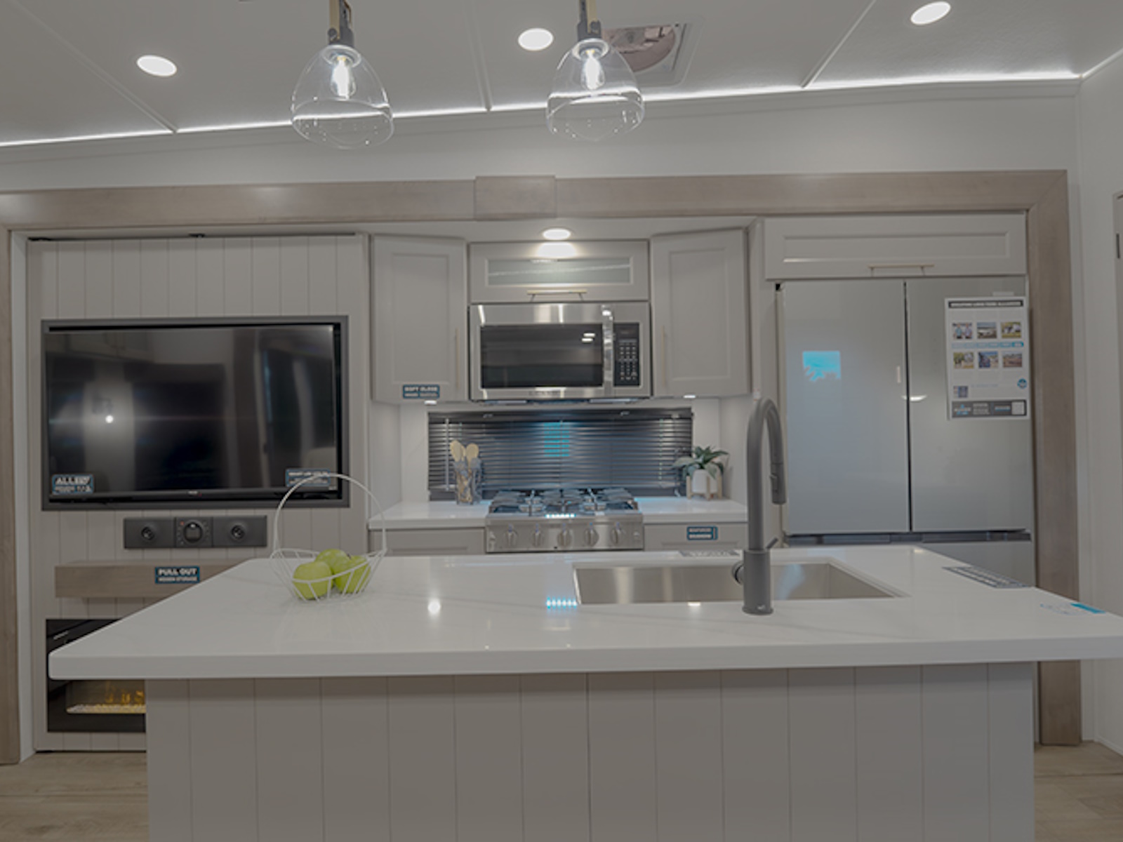 Step inside to a rear living area that’s designed for relaxation and entertainment. The dual recliner love seat faces a cozy fireplace and a large 50" Smart TV—the perfect setting to unwind after a day of exploring. The flush-floor kitchen slide creates a spacious cooking and dining area, with a kitchen island featuring a large undermount sink and dishwasher prep option, making clean-up a breeze. You’ll find two pantries for ample storage, plus a residential microwave, range, and a 3.73 cu. ft. oven to prepare delicious meals on the road.