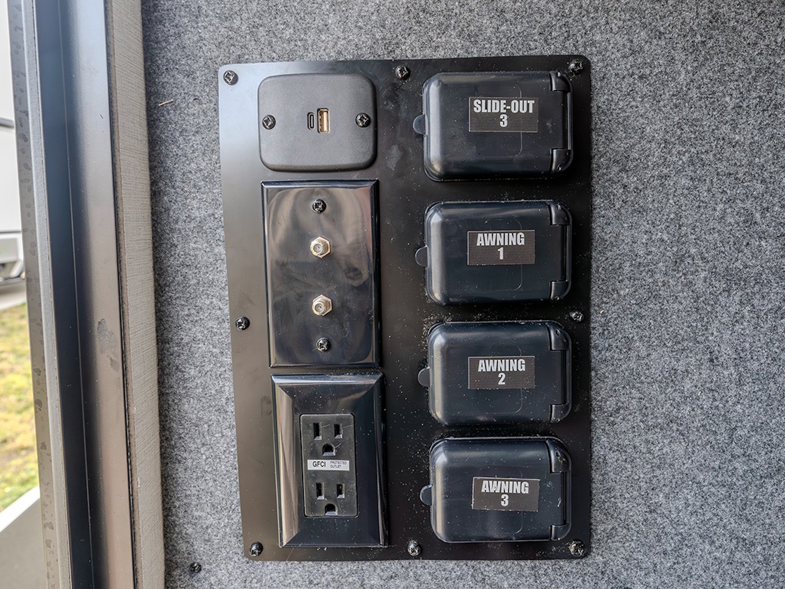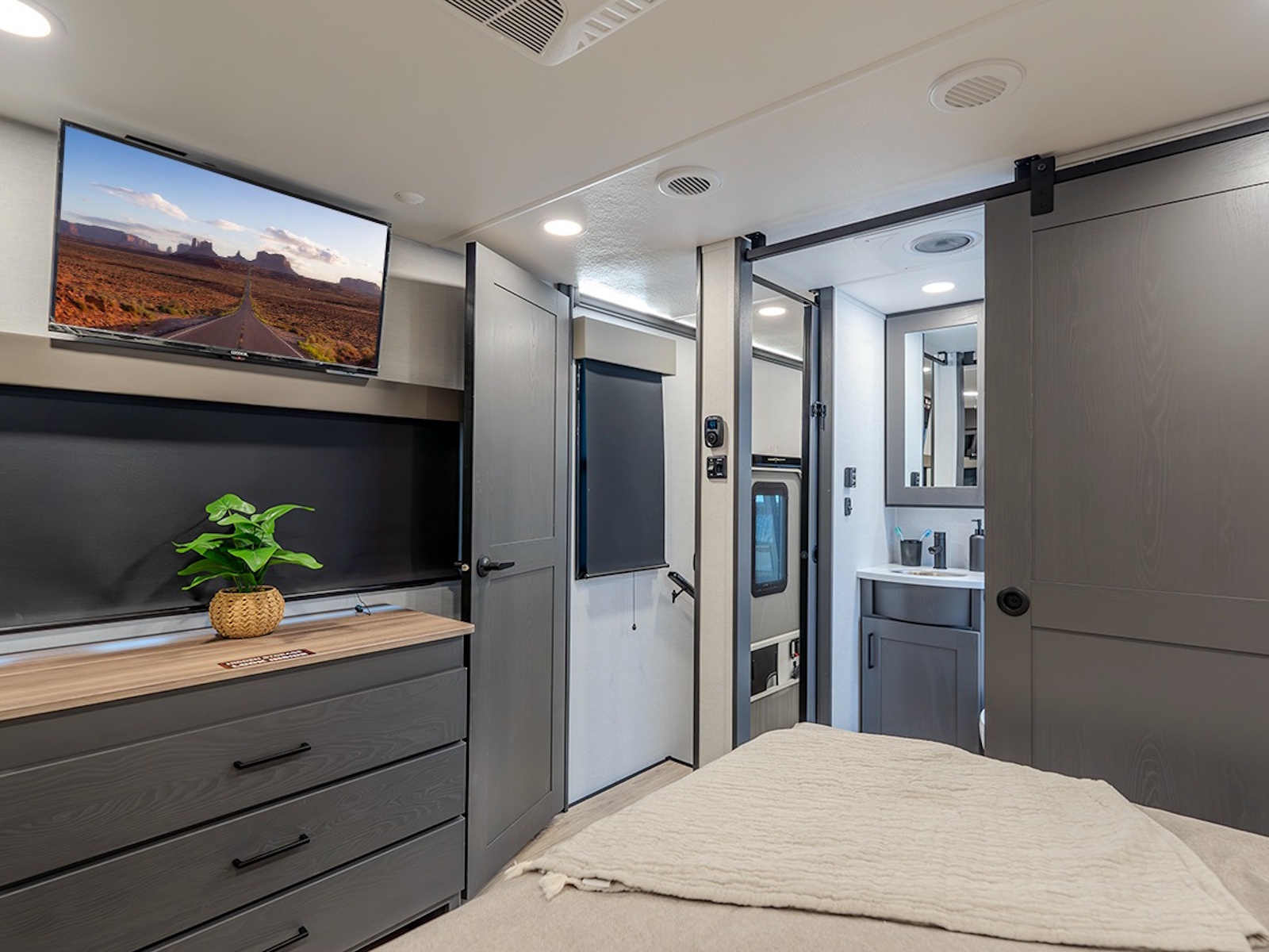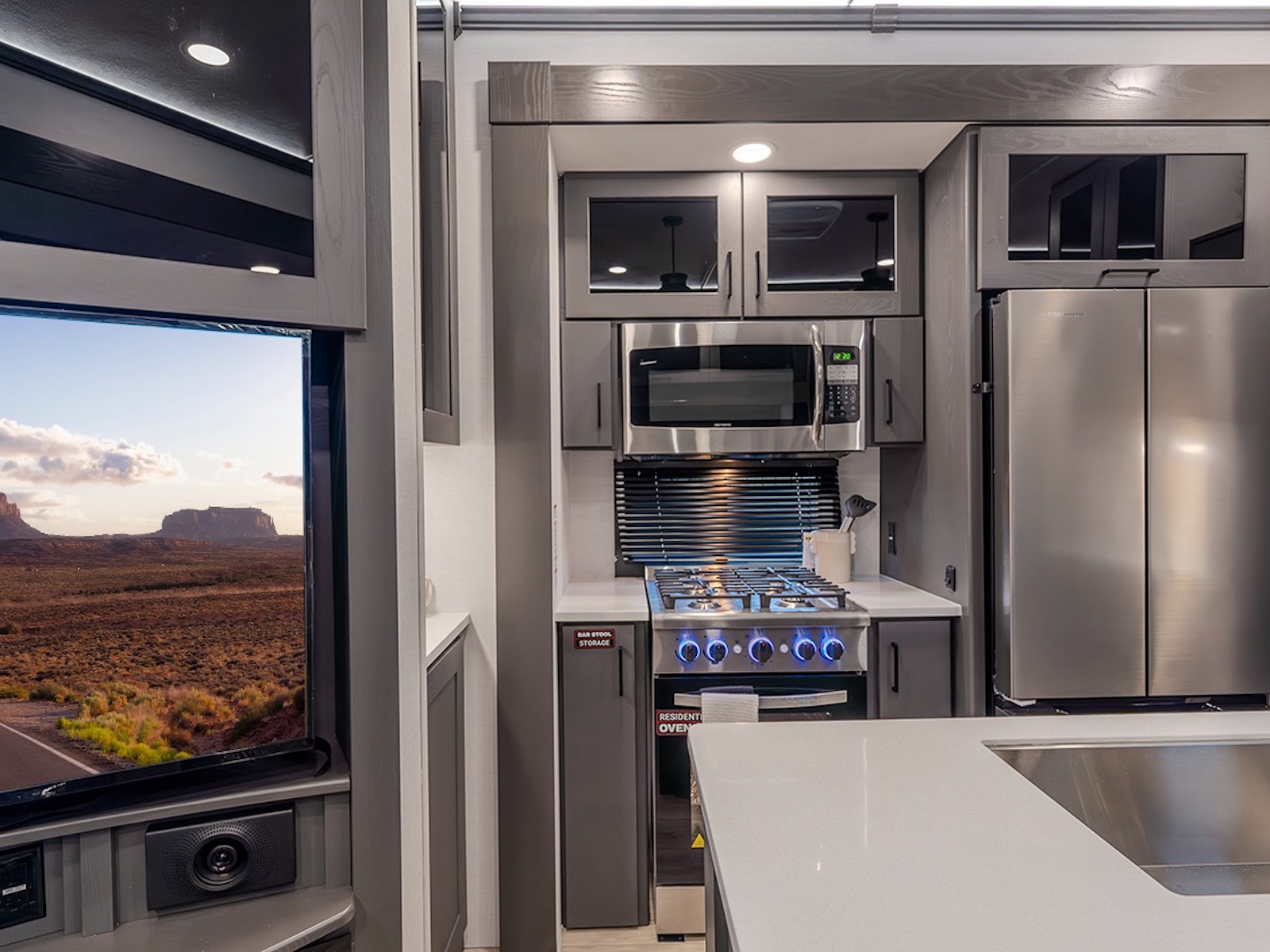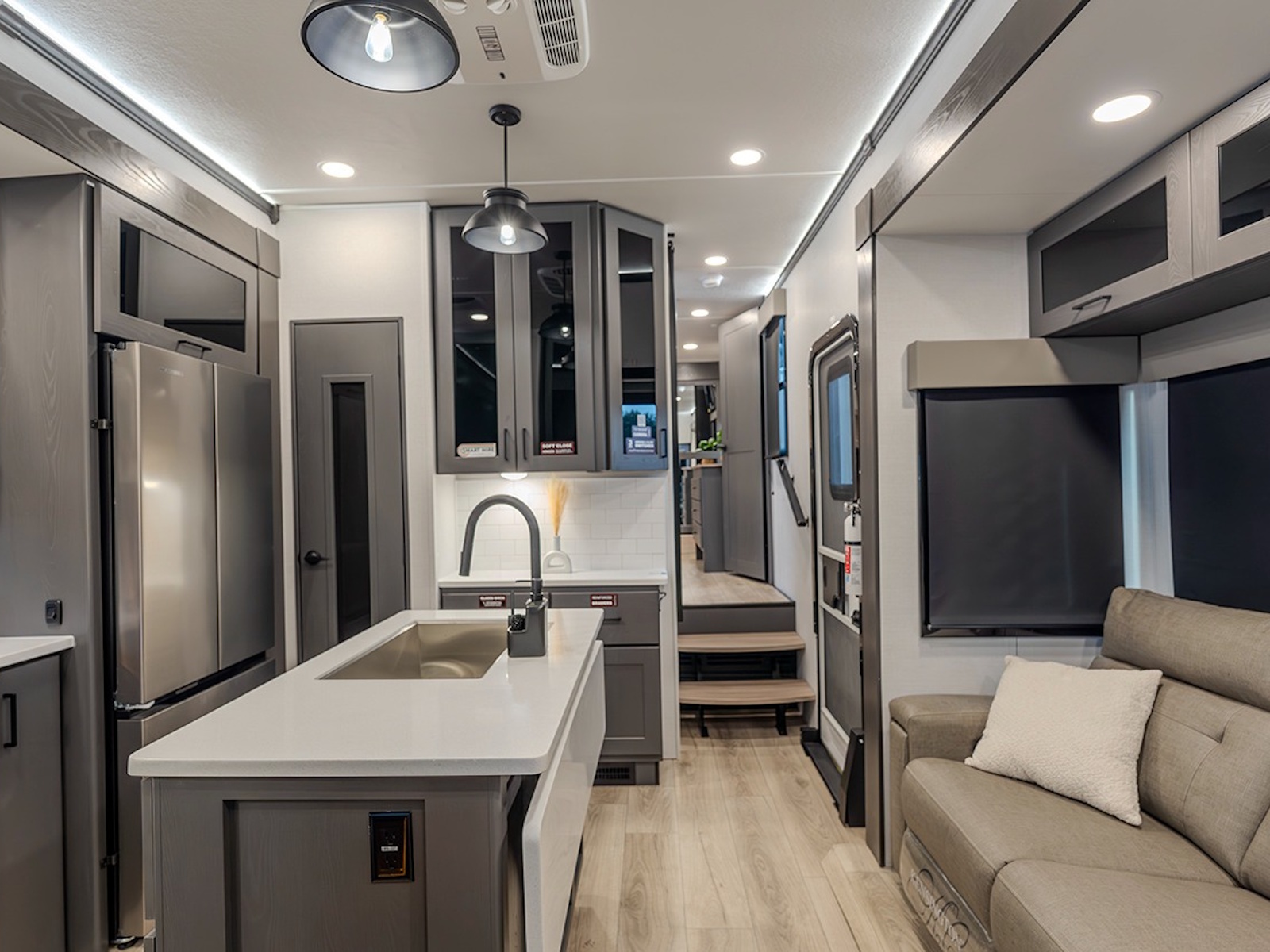 The kitchen is fully equipped to prepare your best meals with two hutches, three pantries, and a kitchen island with two bar stools for a casual dining experience. The dual-entry bathroom includes a 48" x 30" shower and provides direct access to the private front bedroom, ensuring your comfort and privacy. Inside the bedroom, the king bed slide-out gives you extra floor space, while a flip-top dresser and a large front wardrobe (prepped for an optional washer/dryer) provide ample storage.