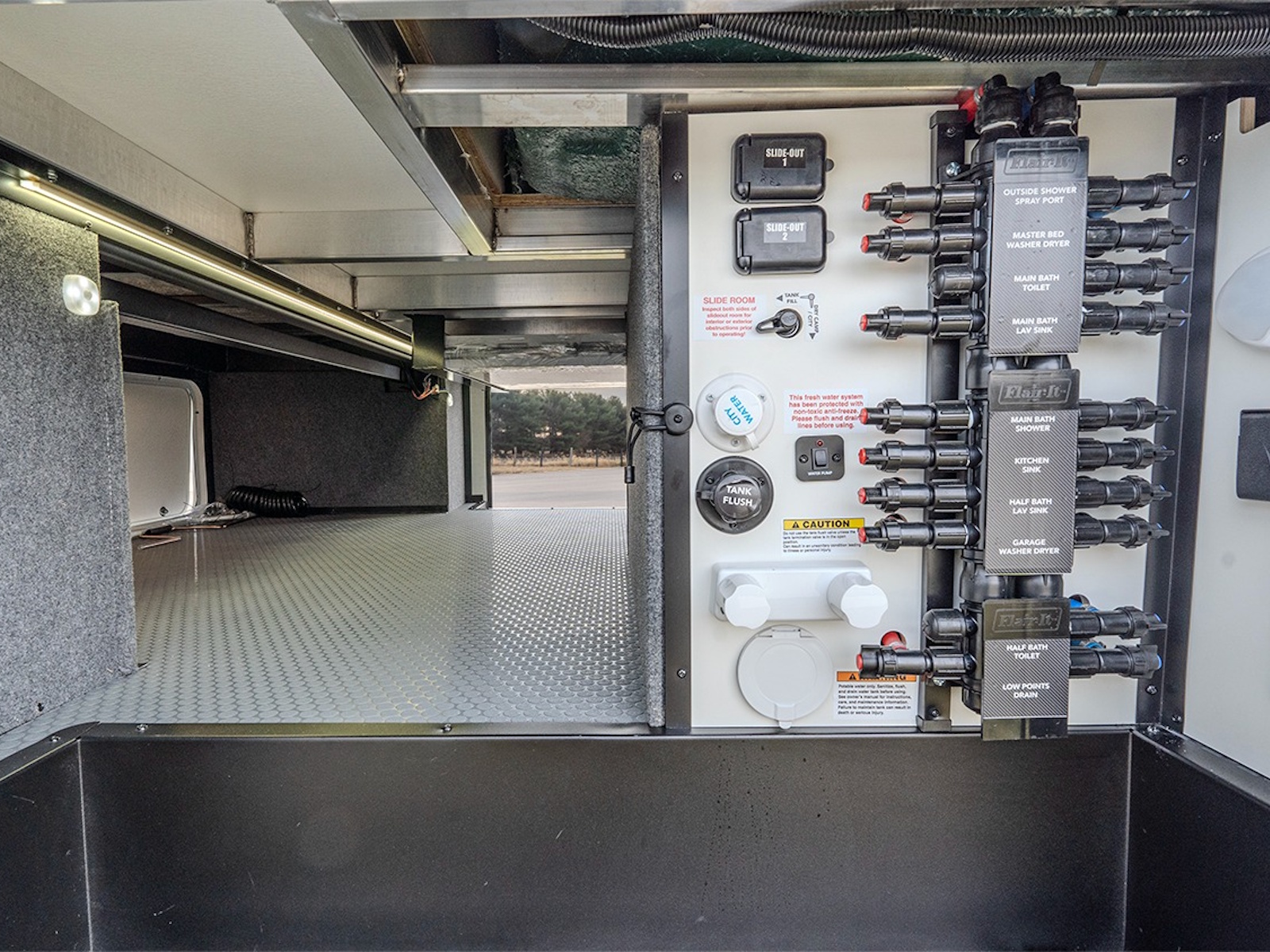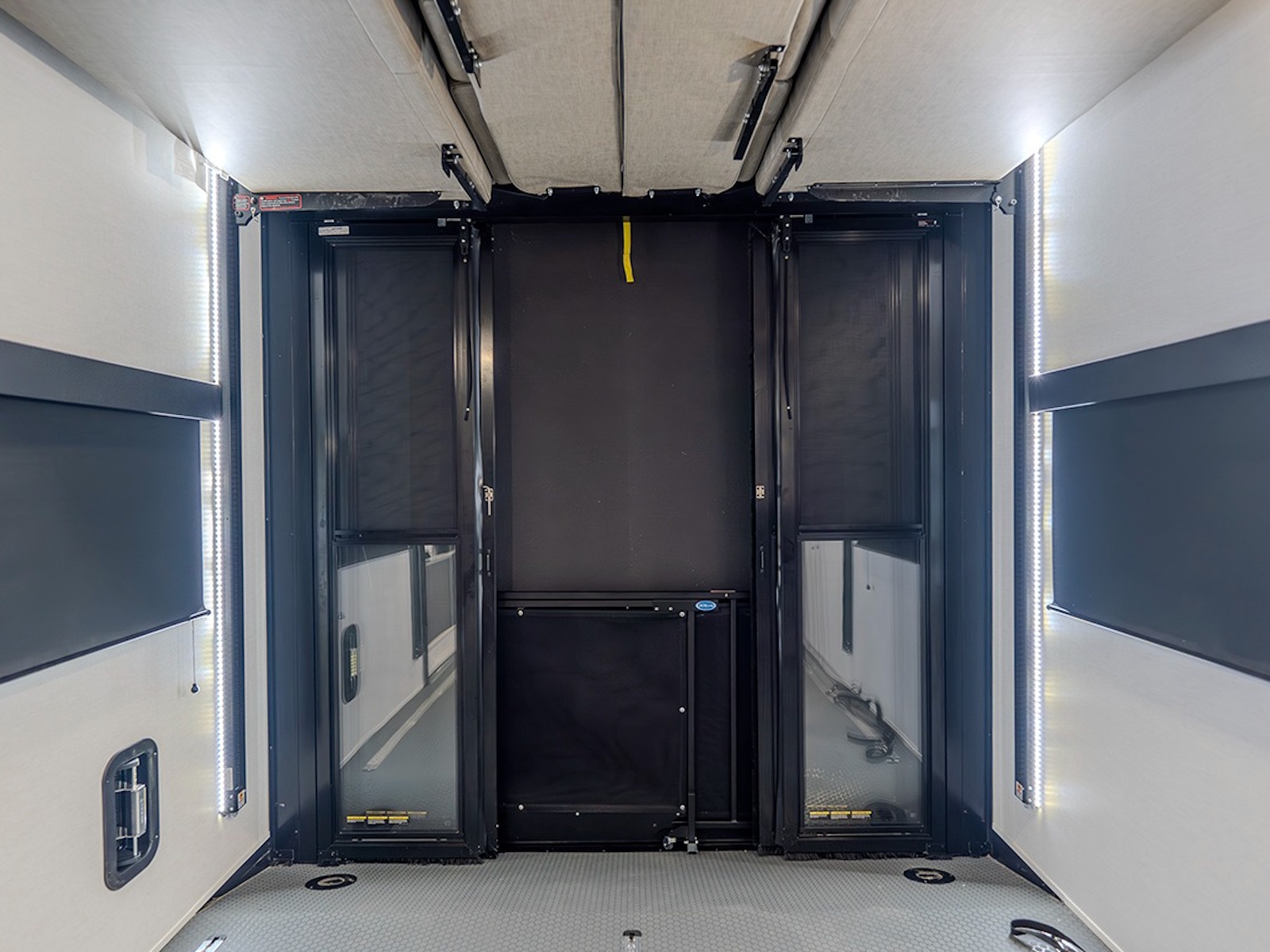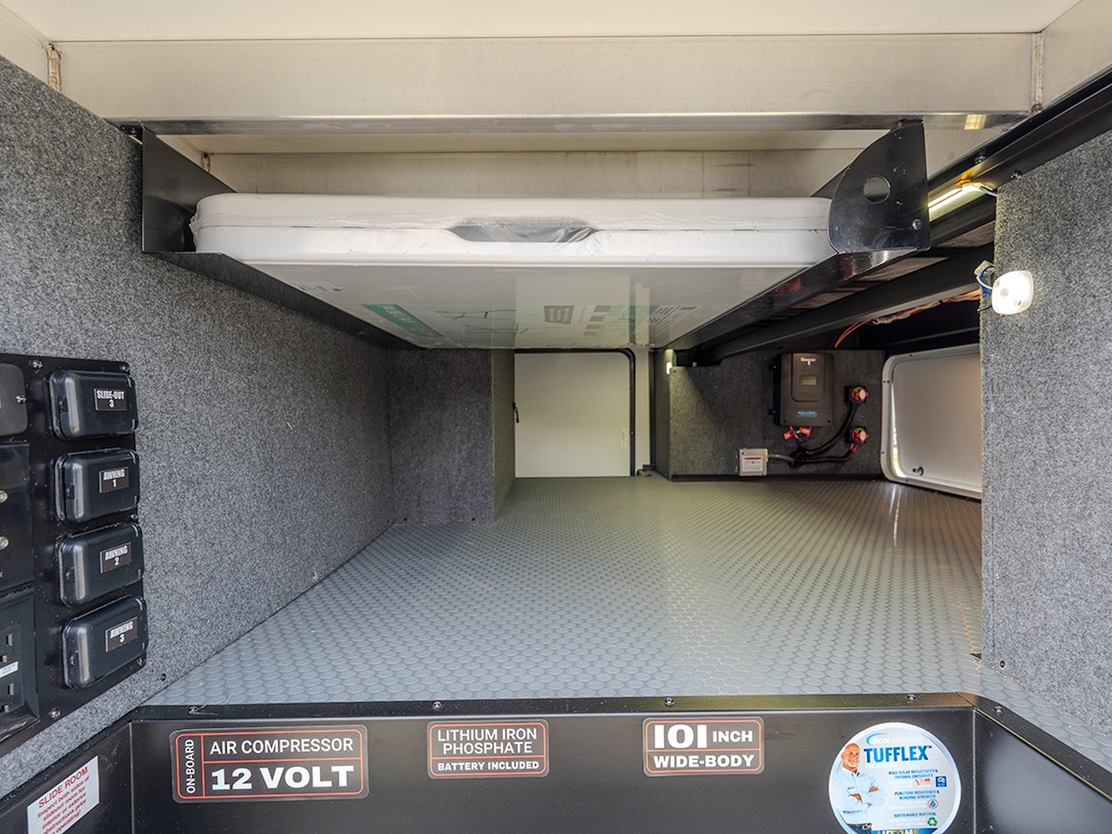 Once you've unloaded your toys, the garage area easily transforms into a spacious living area. The opposing HappiJac sofas provide ample seating, and the drop-down queen mattress offers extra sleeping space when needed. Above the living area, a loft opens to the living room, perfect for additional storage or a cozy sleeping nook. The half bathroom adds convenience for your guests.
