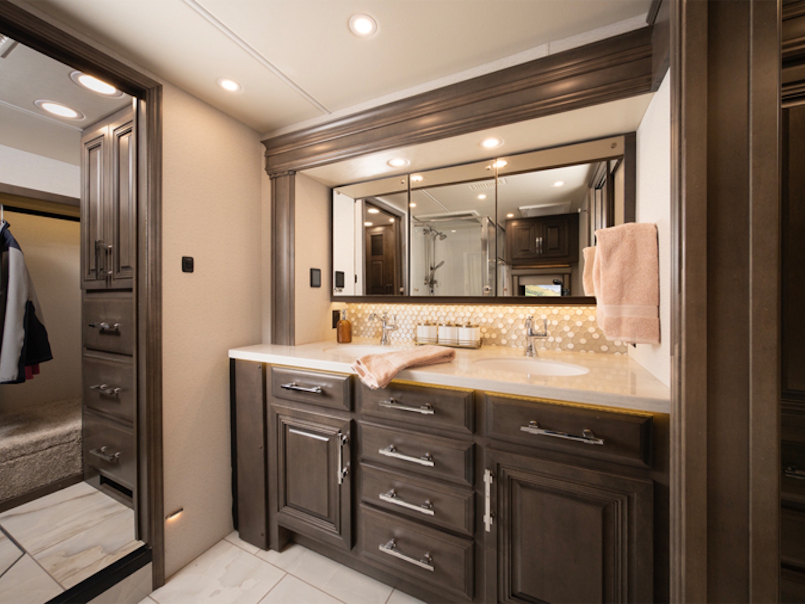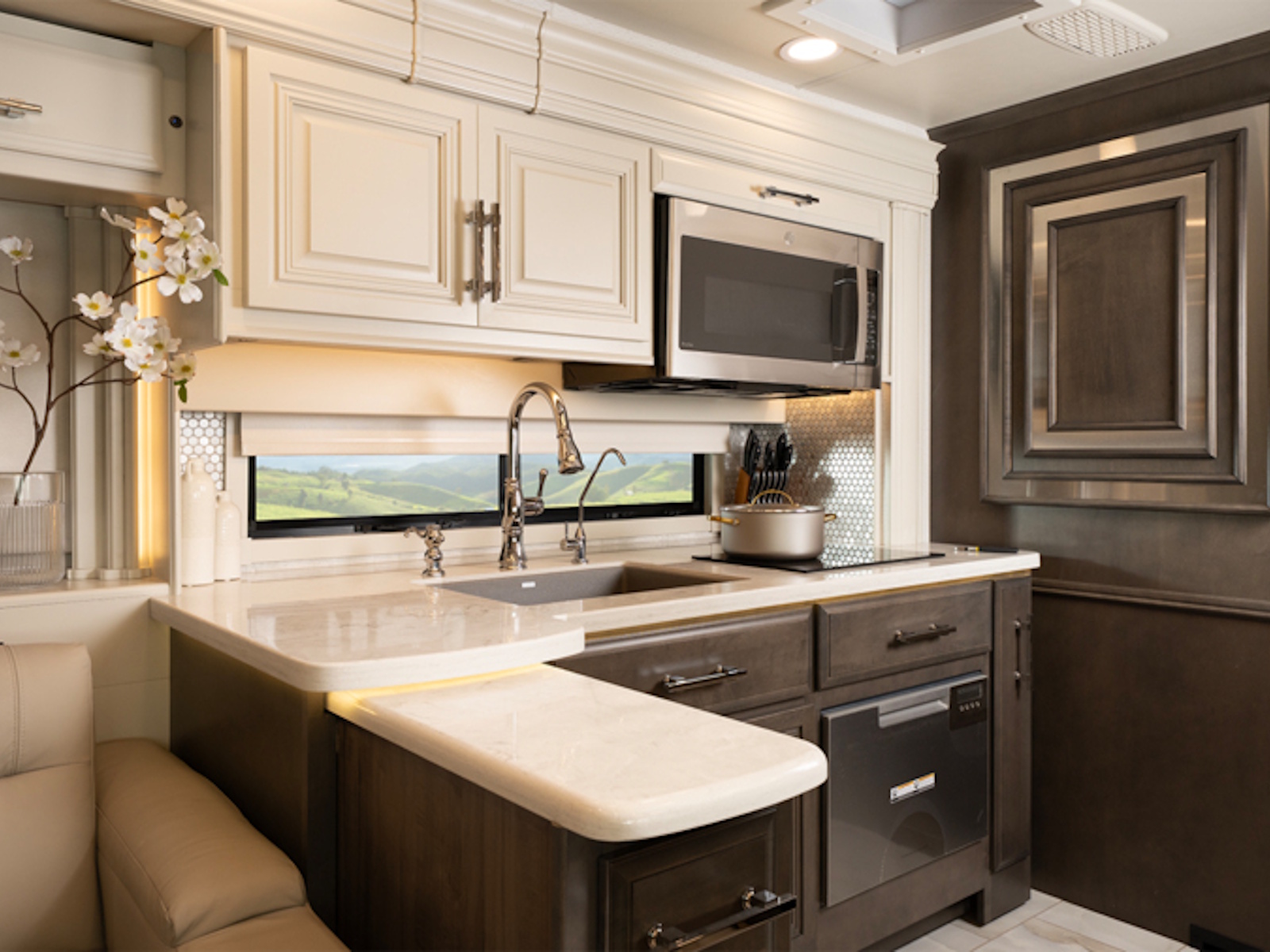 The Anthem has six different layouts available so you can find the perfect floorplan for your needs. If you have been searching for a coach with the bells and whistles of a high-end diesel pusher but in a shorter length, the under-forty-foot 37K will be your answer. Once you decide which floorplan is right for you, choose from four wood colors, three décor packages, three tile colors and six paint packages to ensure your coach is exactly as you have envisioned. Regardless of floorplan, the Anthem features rich fabrics, genuine Italian leather furniture, custom-built hardwood cabinetry, hand-tiled porcelain floors, residential kitchen appliances and top-of-the-line electronics to make you feel right at home on the road, or maybe even better.